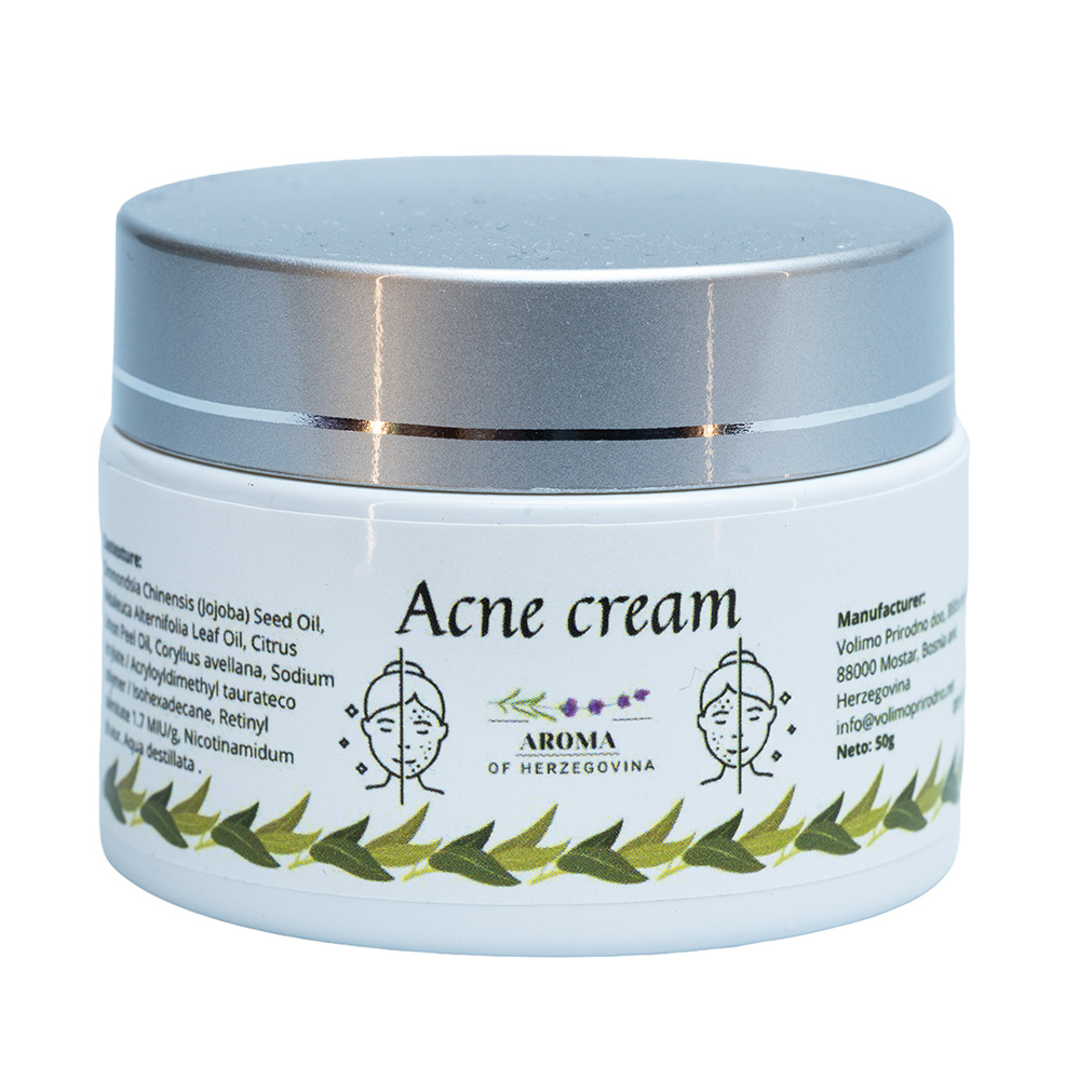Krema za akne je djelotvorna i pouzdana u svakodnevnoj njezi problematične kože. Pomaže u smanjenju postojećih akni te sprječava nastanak novih nepravilnosti. Njena formula umiruje kožu, smanjuje crvenilo i upalne procese. Redovitom upotrebom poboljšava se tekstura i izgled kože. Krema podržava prirodnu ravnotežu kože bez isušivanja. Laganog je sastava i brzo se upija. Koža nakon upotrebe izgleda čišće, zdravije i svježije.