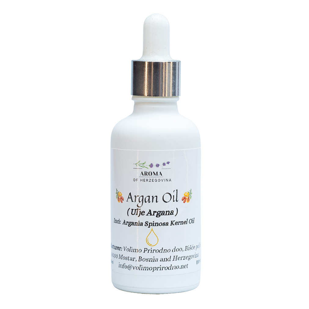 Arganovo ulje je 100% prirodno ulje hladno prešano iz koštica drveta argana. Bogato je vitaminom E, esencijalnim masnim kiselinama i antioksidansima koji dubinski hrane kožu i kosu. Redovnom upotrebom pomaže u hidrataciji, regeneraciji i poboljšanju elastičnosti kože. Idealno je za njegu suhe, osjetljive i zrele kože, kao i za jačanje lomljive kose i noktiju. Brzo se upija i ne ostavlja masne tragove. Pogodno je za svakodnevnu upotrebu i za sve tipove kože.