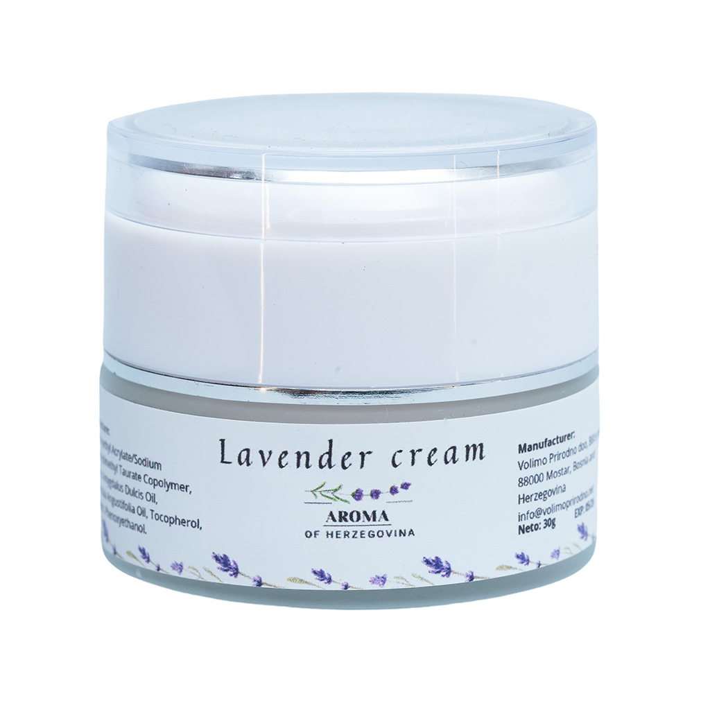 Krema s lavandom pruža nježnu, ali učinkovitu njegu kože kojoj je potrebna hidratacija i umirenje. Lagana, kremasta tekstura brzo se upija i ostavlja kožu mekom i glatkom na dodir. Lavanda je poznata po svojim umirujućim svojstvima, zbog čega je ova krema pogodna i za osjetljivu kožu. Redovnom upotrebom koža izgleda svježije, elastičnije i njegovanije. Ugodan prirodni miris doprinosi osjećaju opuštenosti tokom nanošenja. Može se koristiti za njegu lica i tijela. Idealna je za svakodnevnu rutinu njege, posebno u periodima suhoće i stresa kože.