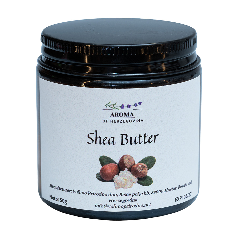 Shea butter je prirodni biljni maslac poznat po izuzetno bogatom i hranjivom sastavu koji intenzivno njeguje kožu. Dobiva se iz plodova afričkog shea drveta i cijenjen je zbog visokog udjela masnih kiselina i vitamina koji pomažu u zaštiti kože od isušivanja. Redovnom upotrebom doprinosi obnovi suhe i osjetljive kože, poboljšava njenu elastičnost i ostavlja osjećaj dubinske njege i mekoće. Idealan je za njegu tijela, ruku, stopala, kao i za zaštitu kože u hladnijim i suhim vremenskim uslovima.